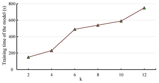 The conclusion drawn from the k-fold cross-verification results is that the model demonstrates better performance metrics as the fold number increases, indicating better generalizability. It is important to note that as the value of k increases, the number of samples used for testing the model decreases, which may negatively affect the model’s generalization ability. Moreover, as the value of k increases, the time required for model training also increases (as shown in Figure 10). After the k value reaches 10, further increasing the k value yields only a minimal improvement in model accuracy. Therefore, considering the balance between model accuracy, generalization ability, and training time, k is set to 10 in the subsequent models, adopting a 10-fold cross-validation method. Compared to single-experiment methods, 10-fold cross-validation provides a more objective and comprehensive evaluation of a model’s performance.