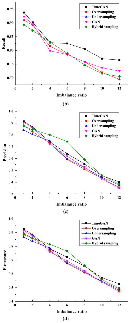 In contrast, except for undersampling and hybrid sampling techniques, other imbalanced data handling methods yield the highest accuracy when the imbalance ratio is 1. Although undersampling results in increased accuracy when the imbalance ratio is less than 4, and hybrid sampling maintains stable accuracy when the imbalance ratio is less than 6, both techniques show that recall, precision, and F-measure are highest when the imbalance ratio is 1. As the imbalance ratio increases, these metrics decline noticeably, demonstrating that the closer the positive and negative sample sizes, the better the model’s ability to accurately detect kicks. When the imbalance ratio is 1, the kick detection model using TimeGAN performs best, followed by GAN. Models trained with other traditional imbalance handling techniques perform less satisfactorily, reaffirming the superiority of the TimeGAN data augmentation technique used in this study.