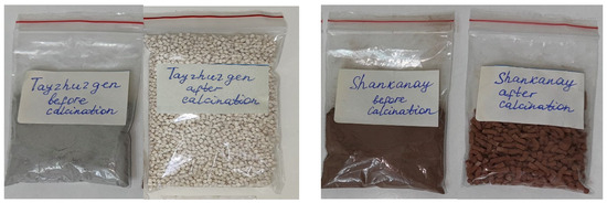 The chemical modification of the zeolites was performed by incorporating 2 wt.% of magnesium oxide (MgO), sodium oxide (Na2O), or lithium oxide (Li2O) relative to the total mass of the zeolite, resulting in a final concentration of 98 wt.% zeolite in each modified sample. Chemical modification of the zeolites was carried out by the mechanical mixing of zeolite and salts (magnesium nitrate, lithium nitrate, and sodium carbonate). The resulting mixtures were mixed with deionized water to form a paste, which was placed in a mini mold. Samples using magnesium nitrate and sodium carbonate were calcined at 600 °C with a heating rate of 2 °C per min. The sample with lithium nitrate was dried at 200 °C for 2 h and then calcined at 750 °C for 3 h. Figure 2 shows photographic images of the samples before and after calcination.