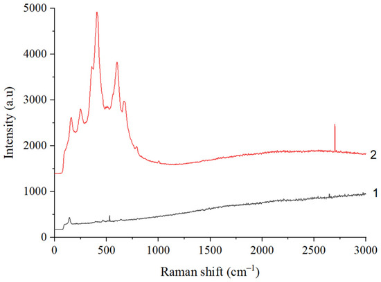 Raman spectra of samples: 1—Tg with mechanical activation before reaction; 2—Tg without mechanical activation, 6:1 before reaction.