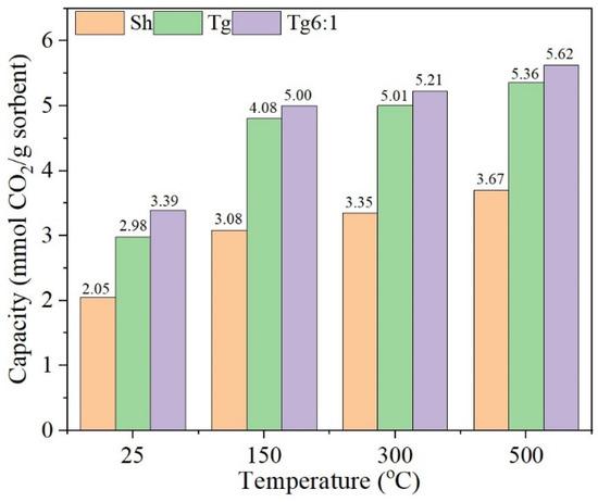 The sorption capacity of zeolites can be enhanced by incorporating various modifying additives into their structure. The most effective modifiers are compounds of alkali and alkaline earth metals [30,31]. Therefore, the mechanically activated Tg zeolite was modified using magnesium, lithium, and sodium compounds. The modified sorbents were evaluated in a flow reactor under atmospheric pressure, targeting CO2 capture. Adsorption capacity was assessed over various temperatures, spanning 50 °C to 500 °C, including intermediate points at 150 °C and 300 °C. Figure 6 presents a comparative analysis of the sorption properties of Shankanay (Sh) zeolite, as well as non-activated and mechanically activated Tg zeolite, under the specified conditions.