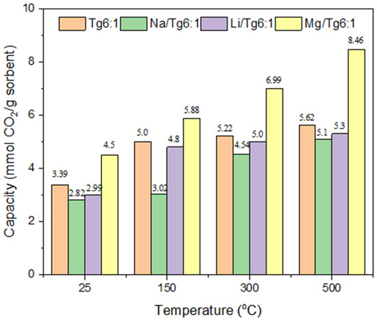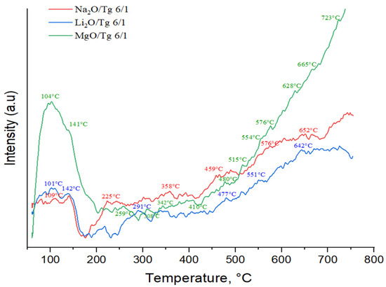 The presence of weak basic sites is associated with surface hydroxyl groups [70]. The medium basic sites are related to metal ions (Mg2+, Na+, Li+) and O2−, where CO2 adsorption occurs. Strong basic sites correspond to low-coordinate oxide sites that interact with CO2, resulting in the formation of bidentate and/or monodentate carbonates [71]. The TPD-CO2 results showed that MgO/Tg 6:1 exhibits the highest overall basicity compared to Na2O/Tg 6:1 and Li2O/Tg 6:1, which positively influences its sorption capacity.