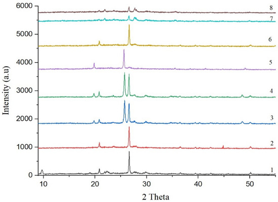X-ray diffraction of samples: 1—Tg 6:1 before; 2—Tg 6:1 after; 3—Li2O/Tg 6:1 before; 4—Li2O/Tg 6:1 after; 5—MgO/Tg 6:1 before; 6—MgO/Tg 6:1 after; 7—Na2O/Tg 6:1 before; 8—Na2O/Tg 6:1 after.