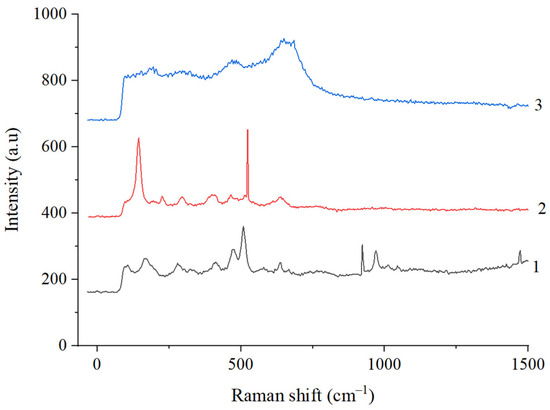 Raman spectra of samples before reaction: 1—Na2O/Tg 6:1; 2—Li2O/Tg 6:1; 3—MgO/Tg 6:1.
