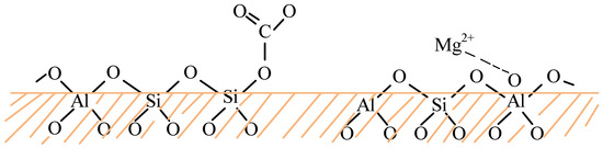 CO2 adsorption on zeolites involves both physical and chemical processes, the efficiency of which depends on the zeolite structure and its chemical modification [72]. Physical adsorption is mainly governed by the interaction of CO2 molecules with the surface of the material through van der Waals forces [73], where CO2 molecules are retained on the zeolite surface via weak non-covalent interactions. In contrast, chemical adsorption involves the interaction of CO2 molecules with active sites on the zeolite surface, leading to the formation of strong chemical bonds, including carbonate compounds. This process ensures more reliable retention of CO2 molecules and contributes to effective gas capture, especially at elevated temperatures. Furthermore, the modification of zeolites with various metal oxides can significantly enhance their adsorption properties by creating additional active sites on the surface. The mechanism of CO2 adsorption on the MgO/Tayzhuzgen 6:1 sorbent is illustrated in Figure 11. The dashed lines represent coordination bonds formed between Mg²⁺ and the oxygen atoms on the surface of the sorbent.