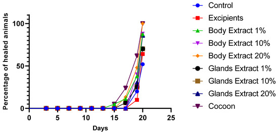 Curves representing the percentage of completely healed animals over time (days) for each treatment group. The x-axis shows the number of days, and the y-axis indicates the percentage of animals fully healed in each group. Treatment groups include Control, Excipients, Body Extract (1%, 10%, 20%), Glands Extract (1%, 10%, 20%), and Cocoon, (n = 5 animals per group).