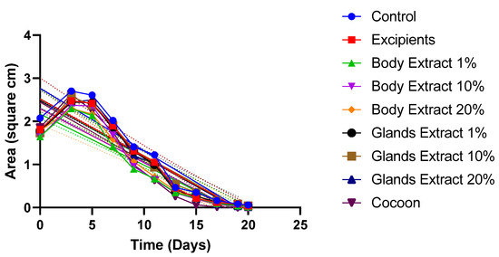 Illustration of the wound area over time (days) for each treatment group. The x-axis represents the time in days, while the y-axis shows the wound area. Linear regression lines are included for each group. The treatment groups are Control, Excipients, Body Extract (1%, 10%, 20%), Glands Extract (1%, 10%, 20%), and Cocoon (n = 5 animals per group).