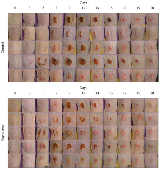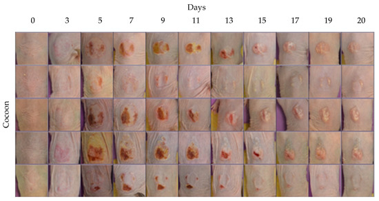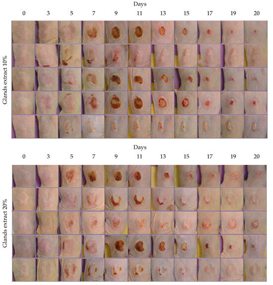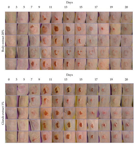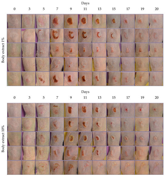 Photographic documentation of the experiment over the entire duration across all treatment groups. Images illustrate burn healing from all the groups, namely Control, Excipients, Body Extract (1%, 10%, and 20%), Glands Extract (1%, 10%, and 20%), and Cocoon. Each group consisted of 5 animals.