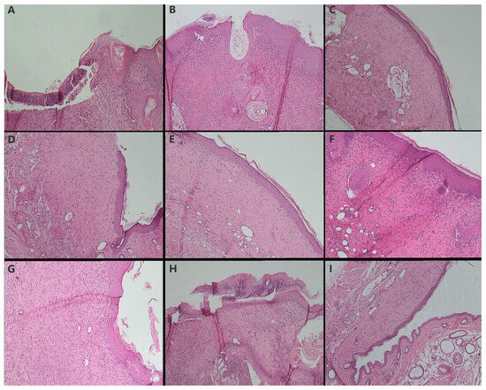 100× photographic capture of hematoxylin-eosin-stained sections from the histopathological evaluation of all groups: Control (A), Excipients (B), Body Extract 1% (C), Body Extract 10% (D), Body Extract 20% (E), Glands Extract 1% (F), Glands Extract 10% (G), Glands Extract 20% (H), and Cocoon (I). The Control and Excipients groups exhibited significant inflammation, tissue damage, and absence of skin appendages. Progressive improvements in tissue healing and reduced inflammation were observed with increasing concentrations of Body Extract, with the Body Extract 20% group showing the most advanced healing and skin appendage formation. Gland Extract groups showed varying levels of healing and inflammation, with the Gland Extract 20% group displaying a worsened histological profile. The Cocoon group demonstrated notable tissue healing, scar formation, and early signs of skin appendage regeneration.