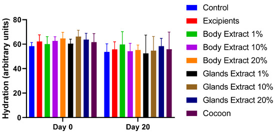 Bar diagram illustrating the hydration measurements at the start and end of the experiment for all treatment groups: Control, Excipients, Body Extract (1%, 10%, 20%), Glands Extract (1%, 10%, 20%), and Cocoon. The bars represent the mean values, and error bars indicate the standard deviation (SD) for each group. The number of animals was n = 5 per group. Statistically significant differences were observed across all treatment modalities.
