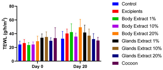 Bar diagram illustrating the Transepidermal Water Loss (TEWL) measurements at the start and end of the experiment for all treatment groups: Control, Excipients, Body Extract (1%, 10%, 20%), Glands Extract (1%, 10%, 20%), and Cocoon. The bars represent the mean values, with error bars showing the standard deviation (SD) for each group. The number of animals was n = 5 per group. Statistically significant differences were observed across all treatment modalities.