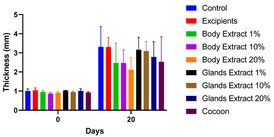 Bar diagram showing skinfold thickness measurements at the start and end of the experiment for all treatment groups: Control, Excipients, Body Extract (1%, 10%, 20%), Glands Extract (1%, 10%, 20%), and Cocoon. The bars represent the mean values, and error bars display the standard deviation (SD) for each group. The number of animals was n = 5 per group.