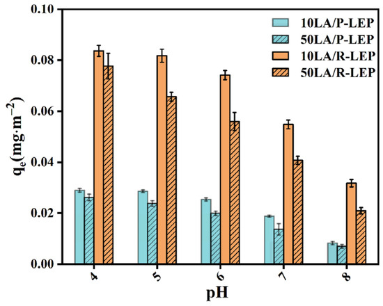 3.4. pH-Dependent Cr(VI) Adsorption onto LEP in the Presence of LA