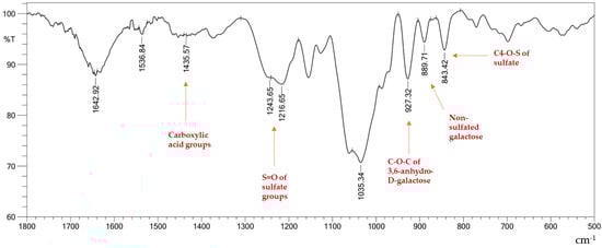 Small to medium absorption bands in the 1600 cm−–1300 cm− region correspond to the vibrations of carboxylic acid groups, while the bands in the 1570 cm−–1540 cm− region are associated with amide (N-H) bond vibrations []. The presence of an absorption band at 1432 cm− in the IR spectrum (Figure 2) indicates the presence of carboxylic acid, suggesting that the carrageenan may contain pyruvylated β-carrageenan.