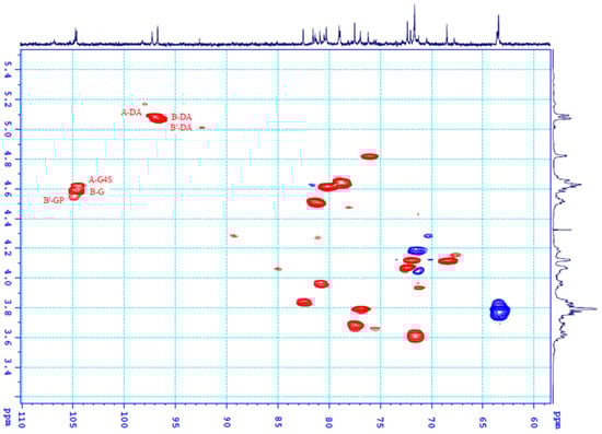 Based on the anomeric region of the HSQC spectrum (Figure 5), in combination with chemical analysis and IR spectroscopy, and in comparison with previously published carrageenan data, we assigned the correlated C/H signals as follows: (104.77/4.62 ppm) and (97.28/5.09 ppm) correspond to κ-carrageenan; (104.65/4.62 ppm), (96.75/5.07 ppm), (104.94/4.58 ppm), and (96.75/5.07 ppm) are assigned to β-carrageenan or pyruvylated β-carrageenan, labeled as A, B, and B′, respectively.