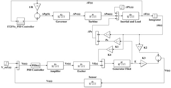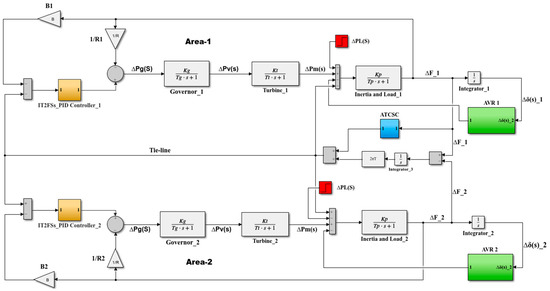 A major obstacle for electrical power system engineers is the parallel regulation of voltage and frequency levels. Any change in these parameters significantly reduces the productivity and efficiency of devices connected to a power supply. The objective of regulating devices used in large and intricate power systems is to regulate small load disruptions and sustain the system’s frequency and terminal voltage within acceptable thresholds. The generating units contain a loop to control the load frequency and reduce the gap between the load and the generated power. The automatic voltage regulator (AVR) system located in the generating units controls the reactive power, thereby regulating the voltage in the power system [1]. Nearly all industrial processes continue to use traditional PID controllers because of their easy control design, cost-effectiveness, and efficacy when used in linear systems [2]. It is essential to tune the PID controller gains with special care to enhance performance. Therefore, choosing the incorrect gains leads to system instability [3]. Computational intelligence is now being extensively used in the field of optimization issues [4,5,6]. Type-2 Fuzzy Set (T2FS) from computational intelligence is a wider and more comprehensive version of Type-1 Fuzzy Set (T1FS), proposed via Zadeh in [7]. Compared to the mathematics of T1F logic control, the computation of T2F logic control presents a significant challenge. The work in [8] introduced a distinct variant of T2FS known as Interval Type-2 Fuzzy Sets (IT2FSs). IT2FSs outputs are characterized by uncertainty within a time period. The IT2F logic controller has been effectively used for the building of controllers [9,10,11,12,13,14,15]. Moreover, implementing a Flexible Alternating Current Transmission System (FACTS) for coupled power systems is a very efficient method of enhancing the system’s stability [16]. FACTS controllers, such as the Interline Power Flow Controller (IPFC), Thyristor Controlled Phase Shifter (TCPS), Static Synchronous Series (SSSC), and Thyristor Controlled Series Capacitor (TCSC), are operated in the tie line of coupled power systems to minimize frequency and power deviations because of their rapid dynamic responses [17,18,19]. The TCSC is a type of FACTS controller that provides strong, effective performance at a reasonable cost and a robust and practical foundation. A novel approach to dynamic modeling and employing the TCSC for Automatic Generation Control (AGC) has been recently introduced [18]. Previous studies have suggested traditional controllers such as PID cascaded and PID controllers, as well as PI controllers. However, other work has suggested new controllers that utilize computational intelligence methods, such as Fuzzy Logic Systems (FLSs), as well as neural systems that fully substitute for traditional controller methods. Additionally, some studies have suggested hybrid controllers that combine traditional controllers with new controller methods, such as Fuzzy PID (FPID) and Fuzzy PI (FPI) controllers, as well as a Gain Scheduled controller [20]. In [21,22], a Fuzzy-Integral (I) controller is used to improve the stability of LFC for dual-area power systems. The works [2,23] focused on using IT2FL. Reference [23] presents a novel approach called IT2FL-based Dual Mode Gain Scheduling (DMGS) for the PI controller. This proposed method involves scheduling the PI controller using a variable selector. Reference [2] presents the development and implementation of an IT2FPID controller, the IT2FPID comprising FSPI with FSPD controllers. The work in [24] also provided research on a Load Frequency Control (LFC) technique that utilizes the T2FLPID controller on dual isolated power systems. The study in [25] focuses on hybrid power systems, specifically optimizing the gains of PI-PD controller parameters using the Particle Swarm Optimization-Gravitational Search Algorithm (PSO-GSA) approach. An Ant Colony Optimization (ACO)-based classical PID controller is developed in [26], and it uses various objective functions to evaluate the performance of a standalone nuclear station. References [27,28] applied a Fractional Order (FO) PID controller to the power system to achieve high performance. In [27], Gases Brownian motion optimization is used, whereas the work in [28] used Big Bang Big Crunch optimization to tune the controller parameters. The studies in [29,30,31] concentrate on the conventional T1FS self-adapting method for PID control. Numerous flexible AC transmission systems are utilized in conjunction with a tie line to regulate power flow and mitigate inter-area oscillations by implementing a supplementary controller [19]. The study in [32] compares the dynamic performance of TCPS and the Capacitive Energy Storage (CES) of AGC for hydrothermal generating connected with hydro diesel generating. The comparison is done using modern techniques in [32]. The study in [33] examines the coordinated design of TCPS and Superconducting Magnetic Energy Storage (SMES) for an uncontrolled thermal power plant. The study considers the Generation Rate Constraint (GRC) in hydro and non-reheat thermal units [33]. The work in [34] involves installing the TCSC in series with the tie line for a dual-area thermal plant, using a GRC and time delay factors, ideally positioned in both areas, where SMES units collaborate with the TCSC to optimize the areas’ overall dynamic efficiency. The work in [35] employs FACTS devices, including SSSC, TCSC, TCPS, and IPFC, and is compared in the existence of the Two Degree of Freedom Integral plus Double Derivative (2DOF-IDD) controller for the AGC of a multi-area thermal system.