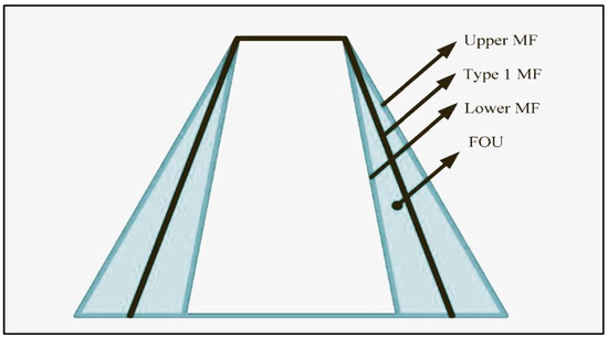 Type-2 Fuzzy Sets (T2FSs) are beneficial when it is hard to calculate an accurate membership function for a fuzzy set, hence facilitating the incorporation of uncertainty [37]. There are two types of Type-2 Fuzzy Set (T2FS): General (G)T2FS and IT2FS. Also, IT2FS calculations are less complex than GT2FS calculations [38], so IT2FSs are used in this paper. In Figure 3, IT2F membership functions are characterized by a pair of Type-1 membership functions, namely the upper membership function and the lower membership function.