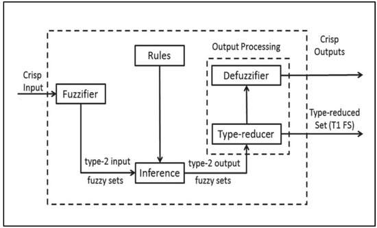 The region enclosed by these membership functions is referred to as the footprint of uncertainty [39]. Also, as shown in Figure 4, an IT2F Logic System comprises five constituents: a fuzzifier, a rule base, a fuzzy inference engine, a type-reducer, and a defuzzifier. The fuzzifier utilizes an attribution mechanism to transform direct external input data into linguistically fuzzy information. The rule base defines the connection between the system’s input and output using If-Then type fuzzy rules, constituting a rule base consisting of control rules. The fuzzy inference engine uses a rule base to perform approximations or fuzzy inferences, resulting in the analysis and acquisition of a fuzzy output [40]. Finally, an output can be obtained by type-reducing the T1FS and defuzzing the crisp value output [39].
