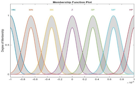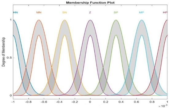 IT2F logic sets in this paper consist of two inputs, namely the Area Control Error (ACE) and ACE derivative (de_ACE), and three outputs, namely Kp, Ki, and Kd. The number of membership functions for each of the inputs and outputs is seven, shown via linguistic variables: High Negative (HN), Medium Negative (MN), Small Negative (SN), Zero (Z), Small Positive (SP), Medium Positive (MP), and High Positive (HP). They are shown in Figure 5 and Figure 6. The type of membership function used is Gaussian for inputs and outputs, and the type reduction method used is the Karnik–Mendel (KM) method because it is an extensive, widely utilized approach for T2F logic uses [41]. The type of fuzzy inference system used is Mamdani type-2, and the centroid method is employed for defuzzification. Table 2 illustrates details about the T2F logic system.