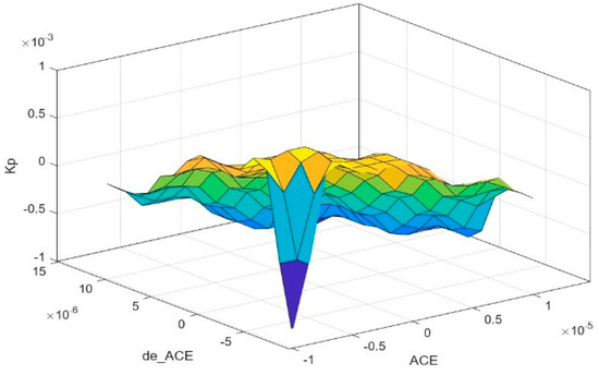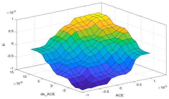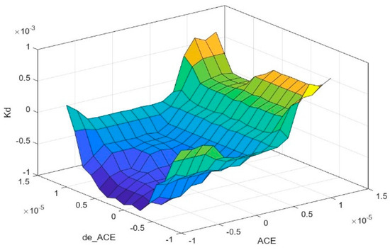 IF-THEN is the rule-based structure utilized by the fuzzy rule base, provided via the IF antecedent, THEN result [42]. This paper’s rule base consists of 49 rules, as illustrated in Table 3, Table 4 and Table 5. Additionally, the Kp, Ki, and Kd control surfaces are shown in Figure 7, Figure 8 and Figure 9.