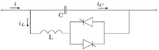 FACTS devices offer enhanced controllability when compared to conventional devices, and they do not contain any dynamic control-providing movable parts, such as mechanical switches [43]. FACTS devices can be configured in two distinct ways: as Series devices or as Shunt devices [43]. TCSC is affiliated with the FACTS group. The TCSC comprises a capacitive reactance in parallel with a Thyristor Controlled Reactor (TCR), as shown in Figure 11, and is mainly used to suppress oscillations, which reflect positively on the stability of the power system and also solve the problem of sub-synchronous oscillation (SSR) [44].