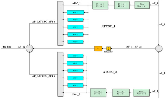 In this paper, when the ATCSC is connected between area-1 and the tie line, Equation (24) is used, but if it is connected to area-2, Equation (26) is used.