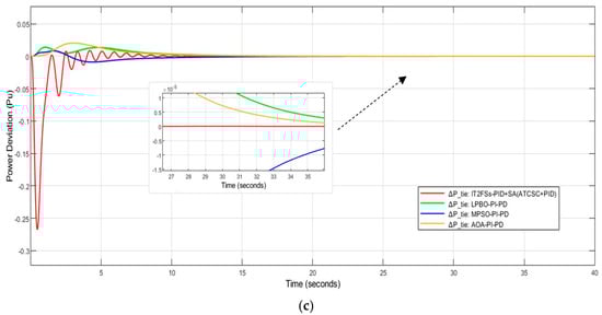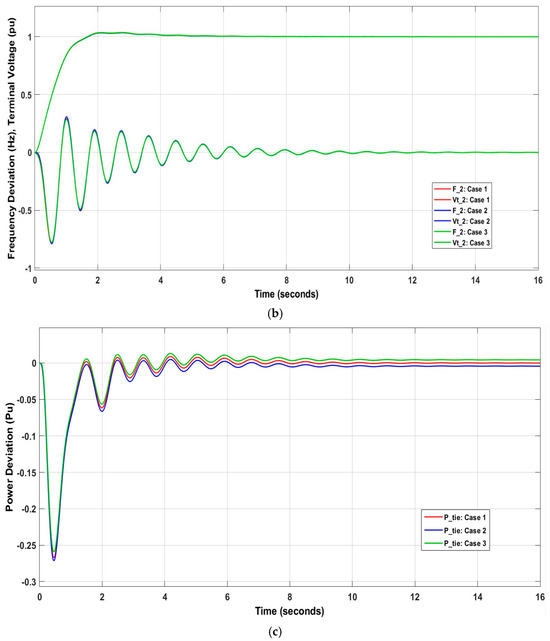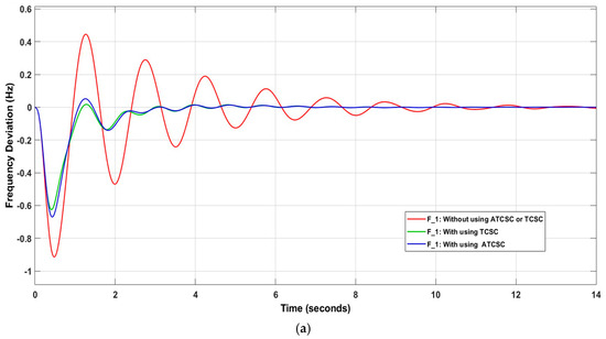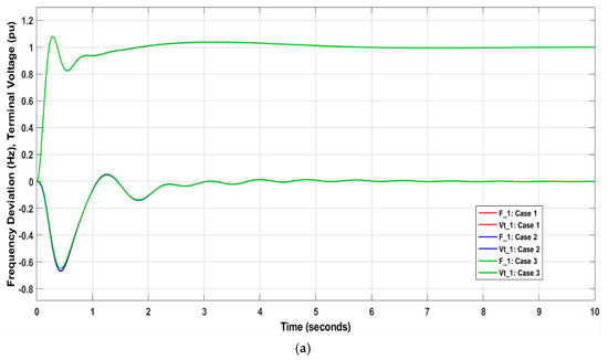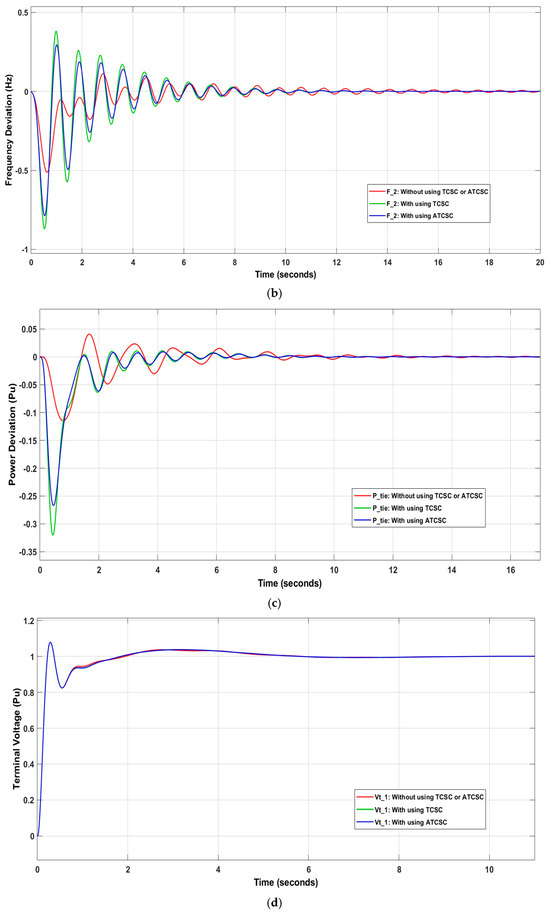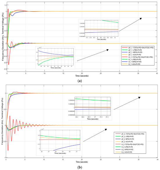 This section delves into the simulations conducted on the power system, examining the effectiveness of the controllers in modifying the system’s dynamic response and presenting the findings from this simulation. An increase in load demand equal to is used in both areas of the power system model. Then, the IT2FSs-PID controller in LFC, the SA-PID controller in AVR, and SA-ATCSC are used to make the system more stable. Most of the simulations in this paper focus on this method. An additional ATCSC is added to a final case, and its impact on the power system is observed. The values of the power system modeling can be found in [48]. Table 6 shows the tuning parameter values for both ATCSC and PIDAVR.