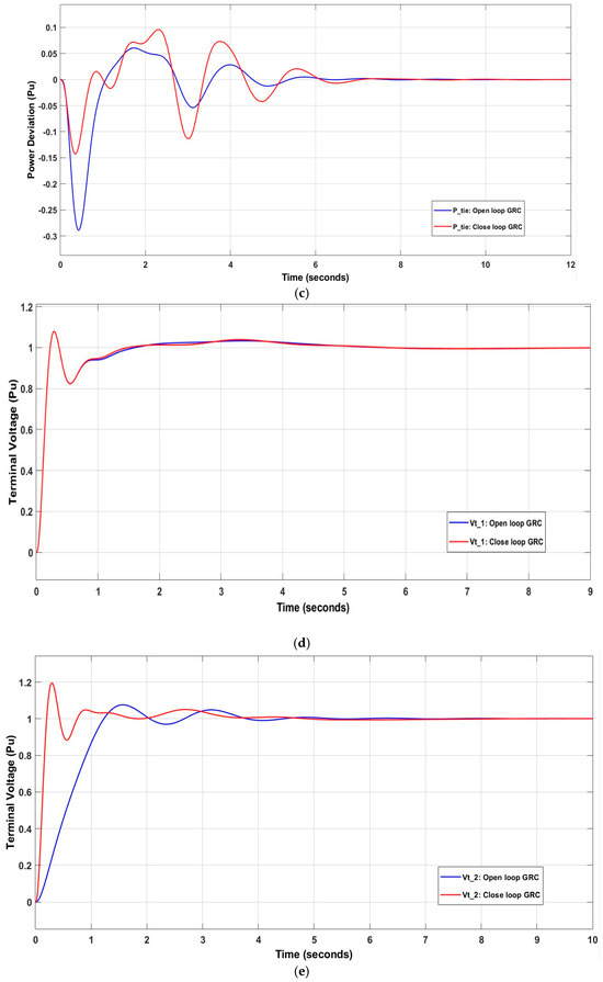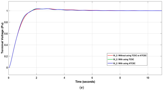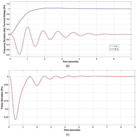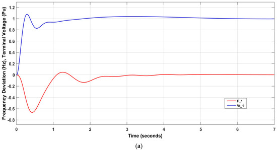 Table 7 shows that the power system is unstable because the settling time values of , , , and are infinite. In this case, the LFC system did not use the IT2FSs-PID controller, and the tie line did not use TCSC or ATCSC. PID-SA exists in the AVR system, so according to Table 8, it is clear that frequency stability affects the terminal voltage stability.