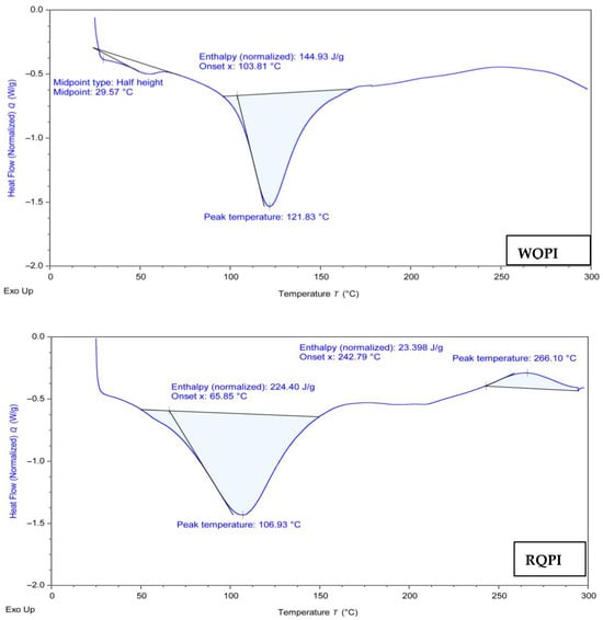 During the temperature scan from 0 to 300 °C, both RQPI and WQPI (Figure 2) showed a major endothermic peak at around 106.93 °C and 121.83 °C, respectively, indicating protein denaturation. However, RQPI exhibited an additional exothermic peak at 266.10 °C. These multiple denaturation peaks are attributed to the complex composition of quinoa albumin and globular chenopedin proteins [7]. Similar findings were reported by Shen et al. [39], who noted that the spray- and vacuum-dried proteins lacked lower temperature denaturation peaks, likely due to partial denaturation during drying. Notably, the spray- and vacuum-dried proteins showed significant exothermic peaks at 148 °C and 172 °C, respectively, attributed to protein aggregation upon heating [41]. Das et al. [31] highlighted that denaturation temperatures can be influenced by extraction methods; the proteins extracted at pH 8 to 10 exhibited an endothermic peak, whereas no peak was observed at pH 11 due to denaturation during extraction. Additionally, Shen et al. [39] stated that protein denaturation and aggregation transitions are irreversible processes. The exothermic peak observed in the red quinoa protein isolates suggests a higher level of protein aggregation compared to the white quinoa protein isolates. This difference in aggregation may imply that the red quinoa proteins undergo more extensive denaturation or unfolding, potentially due to their distinct amino acid composition and thermal stability [41]. Practically, this could affect the functional properties of the proteins, such as their solubility, emulsification, and gelation behavior, which are critical for applications in food systems [4].