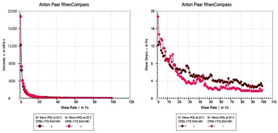 Figure 3 depicts the typical flow and viscosity curves for the protein isolates. The flow behavior was modeled using the power law, and the viscosity (η [mPas]) at the shear rates (D = 50/S) is detailed in Table 3. The flow behavior index (p) showed a distinct decrease with the increasing shear rate (D = 1/S, D = 10/S, and D = 50/S), but at D = 100/S, p started to increase again, indicating significant changes. The viscosity decreased sharply with the increasing shear rates in both the WQPI and RQPI dispersions. As the shear rate increased sufficiently to overcome Brownian motion, the emulsion droplets aligned more along the flow direction, reducing the resistance and viscosity [44]. The pseudoplastic flow behavior observed in the protein dispersions is typical for proteins [2]. The higher viscosity of the RQPI and the lower values of the flow index suggest the formation of complex structures in the RQPI dispersions. The small, rigid particles of the red quinoa proteins likely contribute more effectively to viscosity [45]. In contrast, shear stress disrupts the aggregated structures in WQPI samples, resulting in pronounced shear thinning. Furthermore, structural factors that probably contribute to rheological behavior are molecular weight and protein size, the degree of protein unfolding and aggregation, and the surface hydrophobicity and charge distribution.