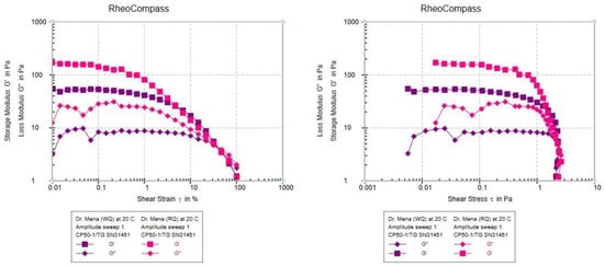 An oscillatory test was conducted to analyze the effects of varying shear stress and strain on the storage modulus (G′) and the loss modulus (G″) of plant-based protein dispersions (WQPI and RQPI). The storage modulus (G′) (Figure 4 and Table 4) indicates the ability of a material to store energy elastically, reflecting its solid-like behavior, while the loss modulus (G″) represents the viscous component, where energy is dissipated as heat through friction [46]. All the samples exhibited linear curves showing degradation patterns in G′ and G″. The G′ values were consistently higher than the G″ across all the shear stress levels, indicating that the protein dispersions effectively stored energy. WQPI displayed the highest initial G′ values, starting at 54.863 Pa at 0.0056648 Pa shear stress, decreasing to 48.327 Pa at 0.0072065 Pa shear stress, and then increasing again to 54.029 Pa at 0.037278 Pa shear stress. Subsequently, the G′ gradually declined to a minimum of 1.2199 Pa at 2.1473 Pa shear stress. Conversely, RQPI initially showed higher G′ values, ranging from 171.07 to 99.249 Pa as the shear stress increased from 0.01719 to 0.70218 Pa, respectively. However, the RQPI’s G′ values dramatically dropped to a minimum of 1.1868 Pa at the highest shear stress (2.3458 Pa). Regarding G″ (loss modulus), both WQPI and RQPI followed similar patterns. WQPI exhibited maximum and minimum G″ values of 8.9093 Pa and 1.7479 Pa, respectively, with the median values increasing with the shear stress. In contrast, RQPI showed a peak G″ value of 31.166 Pa at a median shear stress of 0.27963 Pa, decreasing to a minimum of 2.0035 Pa at the highest shear stress (2.3458 Pa). This behavior highlights RQPI as superior in maintaining structural integrity under elevated shear stress, demonstrating favorable rheological properties compared to WQPI.