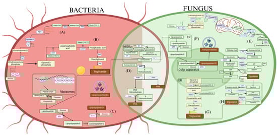 Metabolic pathways for (A) Production of acetyl-CoA and fatty acids from glucose in bacteria. (B) Production of triglycerides in bacteria. (C) Production of lipopeptides in bacteria from ribosomes and NRPS (non-ribosomal peptide synthetases). (D) Production of polyhydroxyalkanoates (PHA) and polyhydroxybutyrates (PHB) from acetyl-CoA in bacteria and fungi. (E) Production of acetyl-CoA and fatty acids from glucose in fungi. (F) Production of lipopeptides in fungi from NRPS. (G) Production of triglycerides in fungi. (H) Production of squalene and ergosterol from acetyl-CoA in fungi.