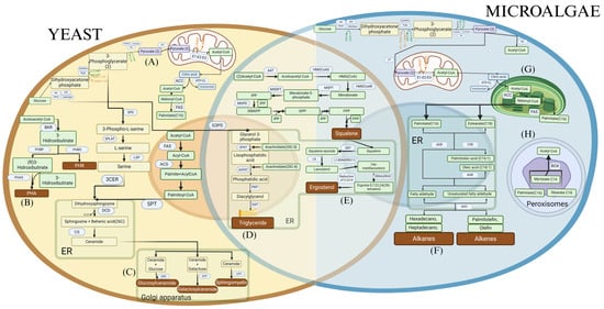 Metabolic pathways for (A) Production of acetyl-CoA and fatty acids from glucose in yeasts. (B) Production of polyhydroxyalkanoates (PHA) and polyhydroxybutyrates (PHB) from acetyl-CoA. (C) Production of sphingolipids in yeasts. (D) Production of triglycerides in yeasts and microalgae. (E) Production of squalene and ergosterol in yeasts and microalgae. (F) Production of hydrocarbons in yeasts. (G) Production of acetyl-CoA and fatty acids in microalgae. (H) Production of acetyl-CoA in microalgae through peroxisomal degradation.