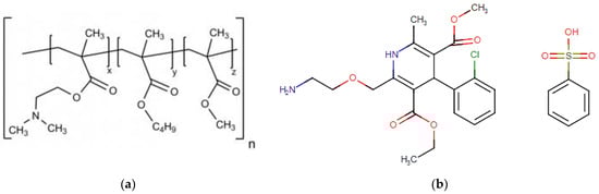Poly(dimethylaminoethyl methacrylate/butyl methacrylate/methyl methacrylate) (E100, 2:1:1, Figure 1a), in granules, and pH-soluble (below 5.0) was purchased from Evonik Industries, Essen, Germany. The model drug Amlodipine Besylate (Aml, Figure 1b) (C20H25ClN2O5C6H5SO3H, white powder, purity ≥ 98%, the molecular weight of 567.05, saturation solubility of 7.4 µg/mL (in water), LD50 oral-rat at 393 mg/kg with acute toxicity (Category 4, H302-Regulation (EC) 1272/2008 of the European Parliament and Council), and monopotassium phosphate salt (MKP, powder) were purchased from Sigma Aldrich, St. Louis, MO, USA. Sodium hydroxide was obtained from Êxodo Científica, Sumaré, Brazil. All reagents were used as received.