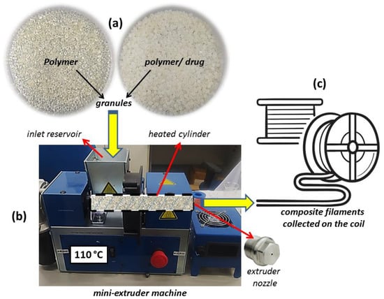 (a) Unmixed polymer and polymer/drug granules; (b) mini-extruder machine details; and (c) illustration of the filaments collected in a circular coil.