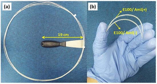 (a) Sample of E100/Aml continuous filament resulting from the extrusion process at 105 °C. (b) Photo image of small segments of E100/Aml filaments under bending after the chemical treatment.