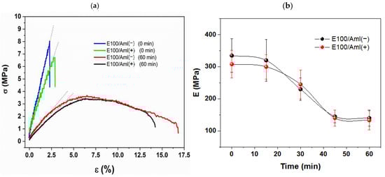 (a) The σ versus ε curves for E100/Aml(−) and E100/Aml(+) filament samples without (0 min) and with 60 min of chemical treatment; (b) elastic modulus (E) of the E100/Aml filaments as a function of the chemical reaction time.