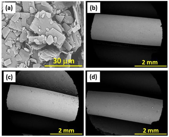 Drug-free filaments ( sample, Figure 5b) were also produced and analyzed for comparison purposes with the /Aml(−) (Figure 5c) and /Aml(+) (Figure 5d) filaments. They all exhibited a surface without apparent structural defects (no bubbles, no cracks, and/or abrupt variations in diameter resulting from heating are visibly observable). The absence of these geometric discontinuities is a determining factor for the usability of these filaments in conventional 3D printers [,].