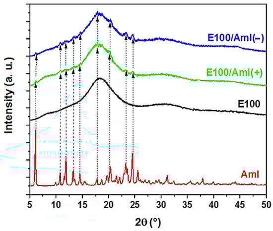The XRD spectra of the /Aml filaments showed similar characteristics, as displayed in Figure 6. The diffractograms of the /Aml(−) and /Aml(+) filament samples showed a broad peak in the same 2θ angle region as observed for the pure E100 filament, which could be attributed to the predominance of the polymeric phase in the polymer/drug sample. In addition, in this 2θ range, although the Aml peaks were not as explicit as in the spectrum of the pure drug sample, it was possible to distinguish small peaks over the trace, indicating the presence of the Aml crystalline phase. This is probably due to the small amount of drug in the samples and/or the decrease in the degree of crystallinity of the drug due to its interaction with the polymeric matrix.