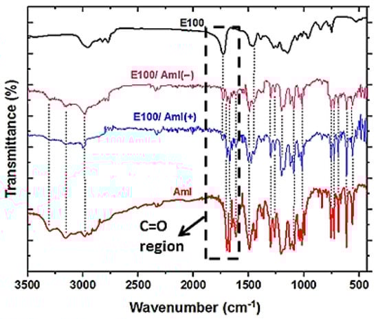 FTIR spectra of the pristine Aml, E100, and E100/Aml filaments. The details show the region of the polymer and drug C=O vibrational bands.