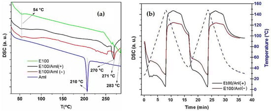 E100, E100/Aml(−), and E100/Aml(+) filaments; (b) DSC curves, with two continuous heating and cooling cycles for the E100/Aml(−) and E100/Aml(+) filaments (temperature range of 30–150 °C).
