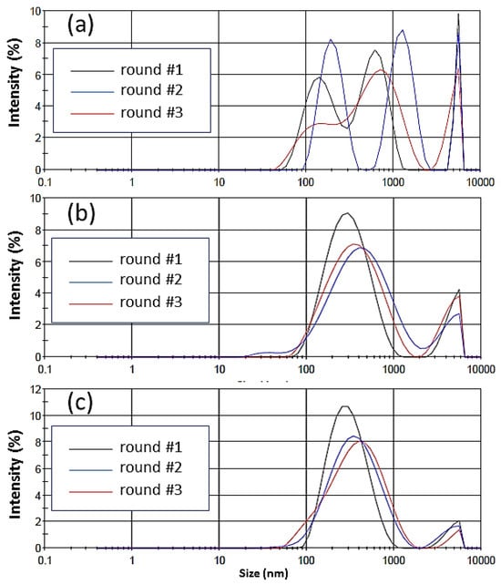 Hydrodynamic particle size in accordance with intensity of the (a) Amlodipine drug supplied by the manufacturer in an acidic medium and (b) Amlodipine drug released from the bulk of the E100/Aml(−) and (c) E100/Aml(+) filaments in an acidic medium. Three rounds of measurements were performed for each sample.