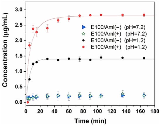 In vitro release kinetics of Amlodipine in acidic (pH = 1.2) and basic (pH = 7.2) media from the polymeric matrix of the E100/Aml(−) and E100/Aml(+) filaments.