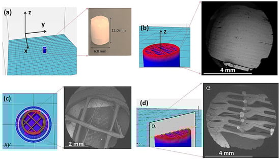(a) CAD project of a 3D model part with a cylindrical shape and a photo image of the corresponding pharmaceutical form, produced from E100/Aml filaments; (b) CAD design and SEM image of the lateral surface of the part; (c) design of the part inner circular section and SEM image of the printed material; and (d) interior of the printed part seen from section α.