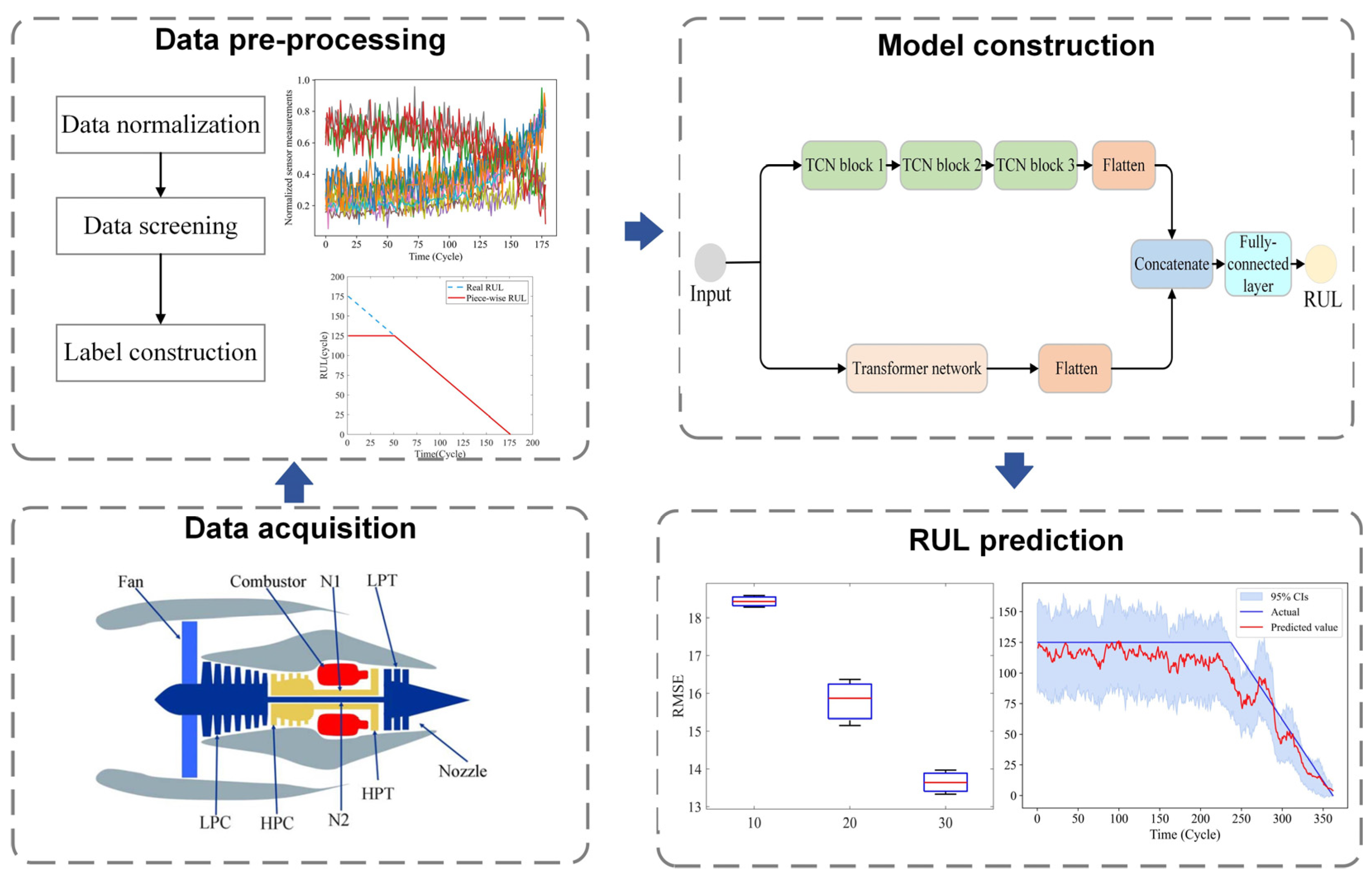 - A dual-channel framework is proposed to adequately combine the benefits of both the TCN and Transformer and obtain a deep degradation representation to realize more accurate RUL prediction.