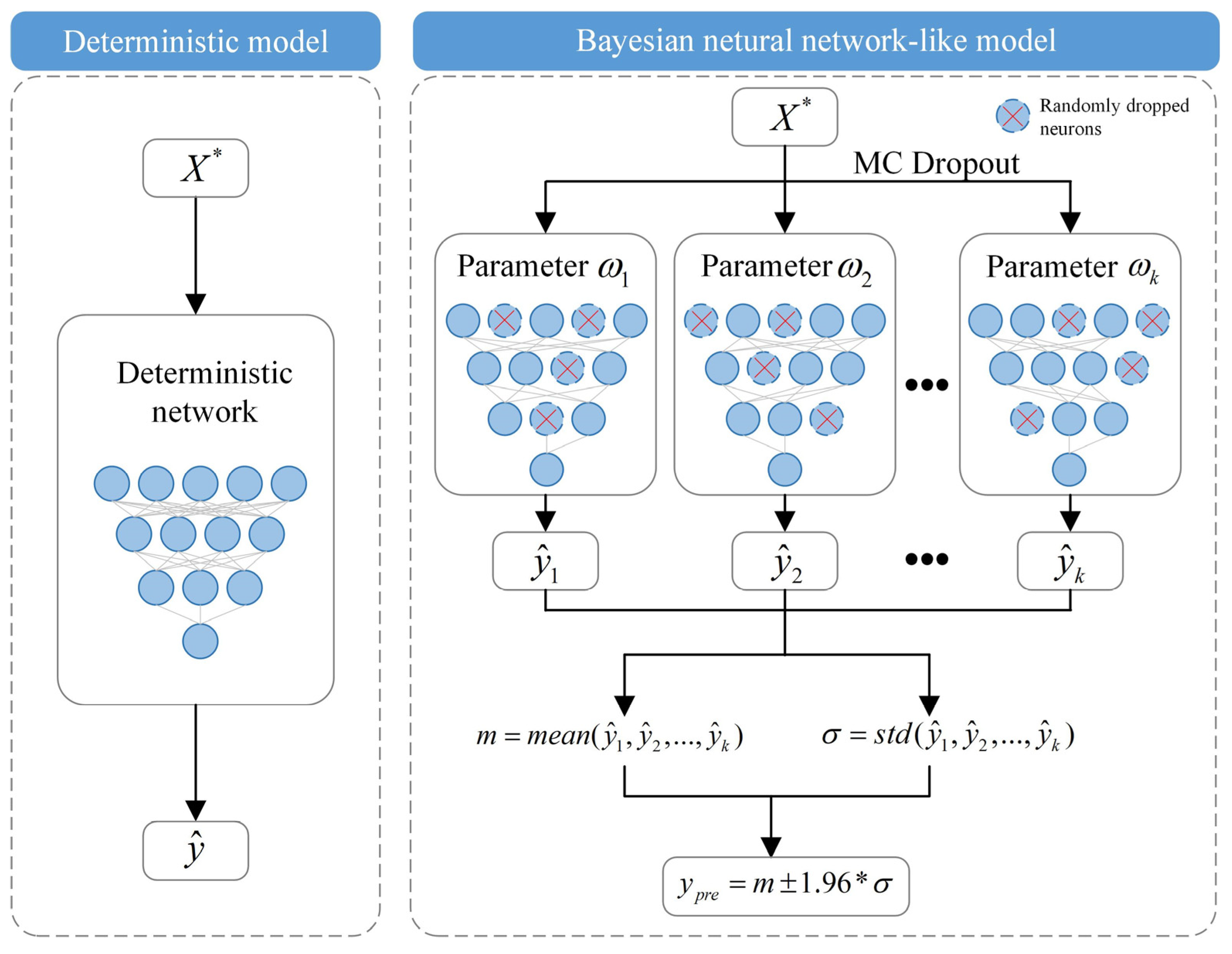 - The MC dropout is introduced into the framework to realize the Bayesian approximation and obtain the uncertainty quantification results.