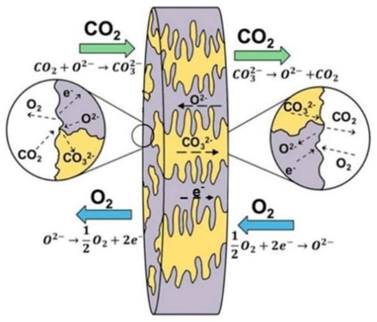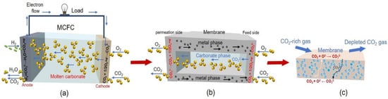The dense carbonate dual-phase membrane, as an emerging technology, has been undergoing a continuous process of evolution and advancement, as illustrated in Figure 1. The concept of a metal–carbonate dual-phase membrane, initially derived from the Moten Carbonate Fuel Cell (MCFC) technology, has been recently explored in the context of academic research [11,12,13]. As shown in Figure 1a, the MCFC demonstrates its suitability for CO2 separation when the fuel (H2) is present and an external current is continuously applied. The CO2 will react with O2 and electrons from the cathode to form CO32−, which is then transported by the carbonate phase to pass through the MCFC. The CO32− species ultimately underwent decomposition at the anode, yielding CO2, O2, and e−. The flow of CO2 across the MCFC is determined by external currents. However, a primary drawback of MCFC for CO2 separation is the low voltages permitted to prevent decomposition of the molten carbonate electrolyte. In this manner, a substantial number of stacks are required to achieve elevated currents and, accordingly, a considerable CO2 capture capacity. However, this significantly escalates the cost.