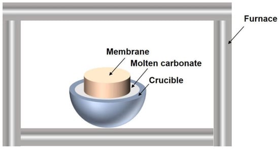 The formation of the membrane support is exclusively achieved through the firing process of the ceramic precursor. The final step in the membrane preparation process involves the infiltration of molten carbonate. In this step, the molten carbonate can infiltrate into the pores of the ceramic support through either capillary driving force or capillary suction. The preheated molten carbonate can directly contact the support, resulting in the pores becoming fully saturated, as illustrated in Figure 2 (utilizing disk membrane as an example). As an indispensable component of the dual-phase membrane, the molten carbonate should ideally exhibit high ionic conductivity to enhance CO2 permeance, as previously discussed in Section 2.2. Meanwhile, the mixed carbonate phase exhibits a high ionic conductivity exclusively in a liquid or melting state, generally speaking. The selection principle for the carbonate phase dictates that the mixed molten carbonate should possess a low melting point and high conductivity. As illustrated in Table 4, Li/Na/K carbonate demonstrates the lowest melting point, whereas Li/Na carbonate exhibits the highest conductivity. The two aforementioned combinations of carbonate are extensively employed in the research process to fabricate the membrane. Furthermore, Gude et al. [31] proposed the utilization of eutectic mixtures derived from the least volatile alkali carbonates and alkaline earth carbonates as an alternative for the fabrication of dual-phase membranes. Here, it is worth noting that the mixed carbonate phase should be formed as a eutectic mixture; otherwise, the melting point of the alkali-metal carbonate mixtures will be elevated as illustrated in Table 5 (take the Li/Na/K mixture as an example) [32].