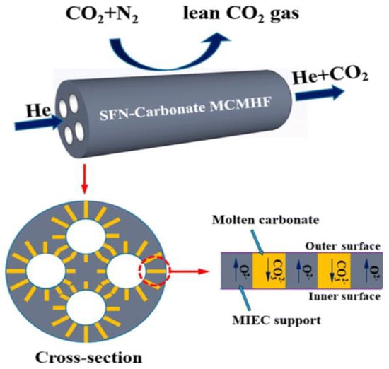 - Jiang, X.; Zhu, J.; Liu, Z.; Guo, S.; Jin, W. CO2-Tolerant SrFe0.8Nb0.2O3−δ–Carbonate Dual-Phase Multichannel Hollow Fiber Membrane for CO2 Capture. Ind. Eng. Chem. Res. 2016, 55, 3300–3307. [Google Scholar] [CrossRef]
