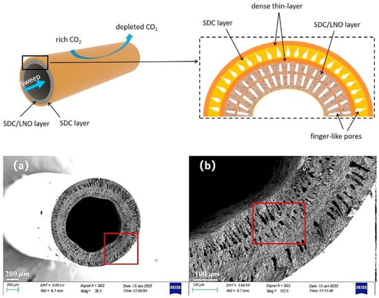 Schematic illustration of double-layer-ceramic–carbonate hollow-fiber membrane: (a) cross-section; (b) magnification of (a); (reprinted from [22] with permission of Elsevier).